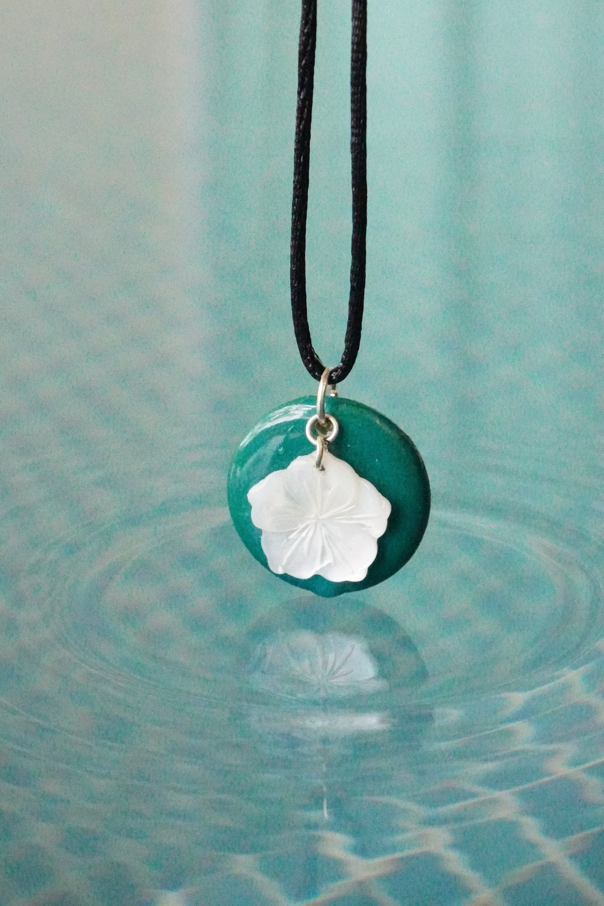 Hibiscus Mother of Pearl on Handmade ceramic pendant. Black adjustable cotton cord.